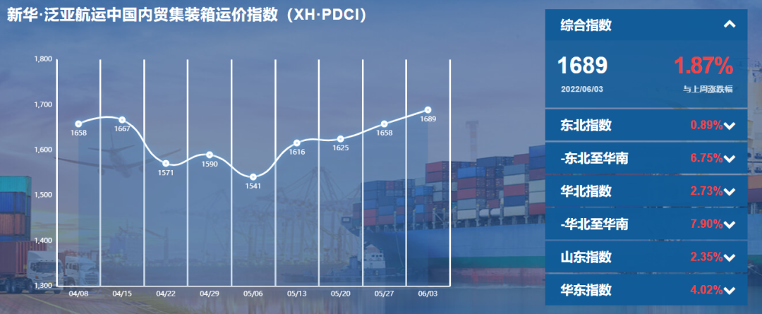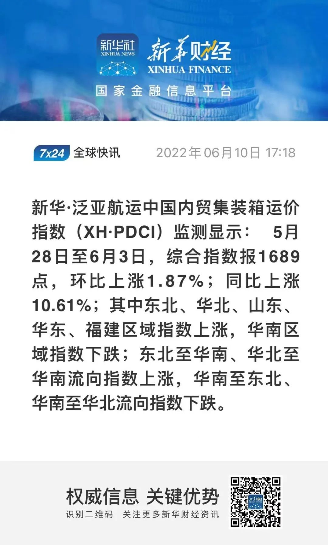 截至6月3日,新華社當(dāng)期報(bào)告·泛亞航運(yùn)中國內(nèi)貿(mào)集裝箱運(yùn)價(jià)指數(shù)(XH·PDCI)報(bào)告1689點(diǎn),較上期(5月21日至5月27日)環(huán)比上漲31點(diǎn),漲幅1.87%;同比上漲162點(diǎn),漲幅10點(diǎn).61%;6個(gè)區(qū)域子指數(shù)五漲一跌,4個(gè)流向子指數(shù)兩漲兩跌。