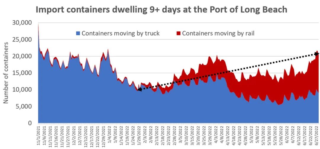 根據(jù)長灘港的數(shù)據(jù),卡車運輸?shù)臏艏b箱約為7個月前的一半。相比之下,鐵路運輸集裝箱堆積如山,自3月份以來一直在上升。