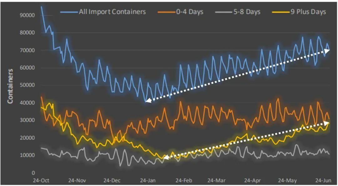 擬議費用將用于在碼頭停留9天以上的卡車運輸進口集裝箱和6天以上的鐵路運輸集裝箱。長灘港根據(jù)卡車運輸和鐵路運輸分類,公開披露了停留9天以上的進口集裝箱數(shù)據(jù),但不包括停留6~8天的鐵路集裝箱。