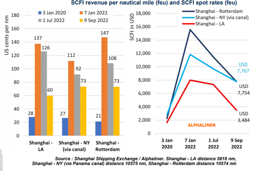 從上海到紐約(經(jīng)巴拿馬)每海的收入等于從上海到鹿特丹每海的收入,航行距離幾乎完全相同。