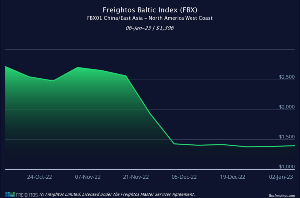 Peter表示,1月6日,從遠東到美國西海岸的出口航線上40英尺集裝箱(FEU)的即期運價已降至1,647美元。而一年前,同樣的航線的運價為接近10,000美元。