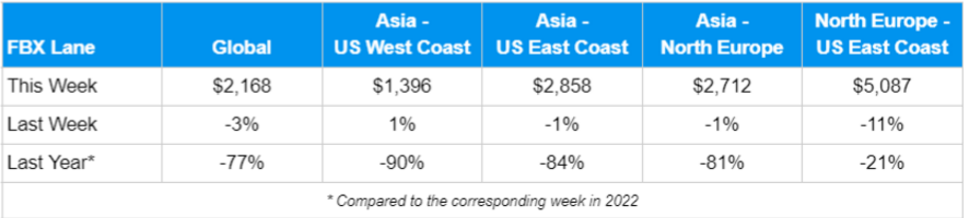 Freightos的數(shù)據(jù)也顯示,亞洲-北歐航線本周集裝箱即期平均運價(FBX11 Weekly)下跌了1%,至2712美元/FEU,比去年同期低了81%。