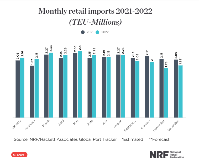 以美國市場為例,據(jù)美國全國零售聯(lián)合會(National Retail Federation,NRF)關(guān)于美國海上進口的最新數(shù)據(jù)估計,12月份的進口量比去年同期下降了10%(為188萬標(biāo)箱),并預(yù)計一直到今年5月份的進口量也將持續(xù)低于2021年2022年的同期水平。