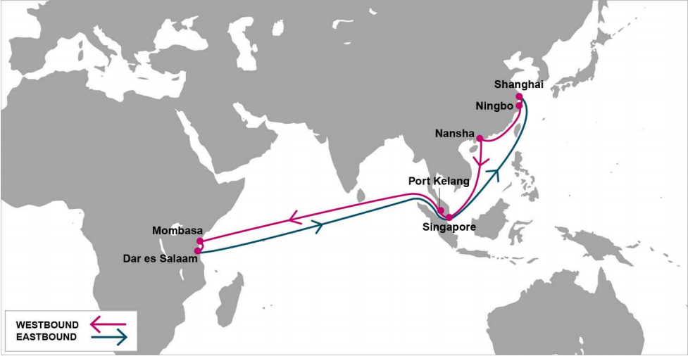 Shanghai 上海 – Ningbo 寧波 – Nansha 南沙 – Singapore 新加坡 – Port Kelang 巴生港 – Mombasa 蒙巴薩 – Dar es Salaam 達累斯薩拉姆 – Port Kelang 巴生港 – Singapore 新加坡 – Shanghai 上海