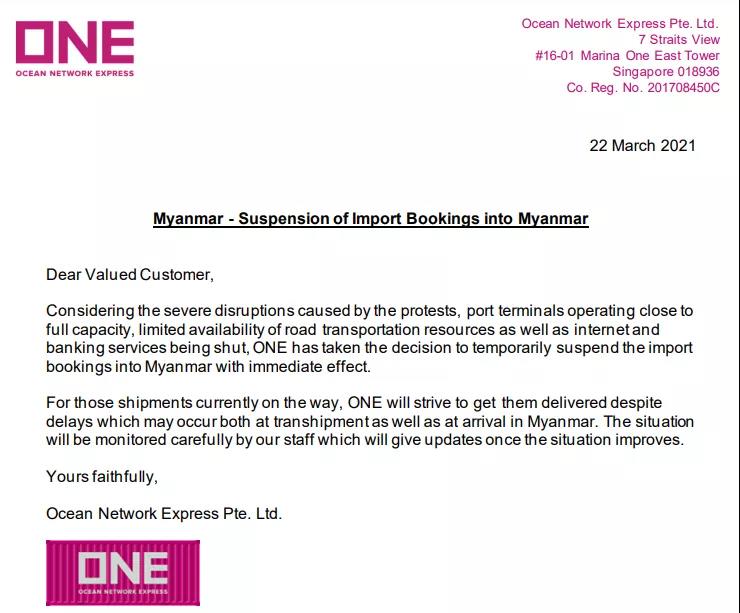 3月22日,船公司ONE公告暫停對緬甸進(jìn)口艙單的預(yù)訂。