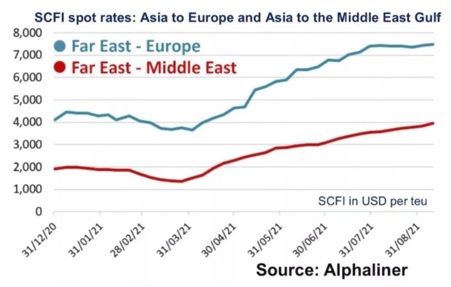 Alphaliner進一步分析稱:華盛頓港口“當(dāng)前亞洲-中東航線運力短缺,不僅是港口擁堵的結(jié)果。事實上,許多船舶已被重新部署到貨物需求更強勁的東西向航線上,因為當(dāng)前從亞洲到北美和歐洲主要航線的現(xiàn)貨運價,處于歷史高位。”
