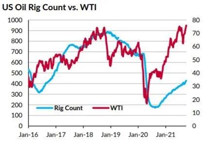 盡管如此, Gibson 預計美國的鉆井活動將繼續(xù)增加。貝克休斯(Baker Hughes)的數(shù)據(jù)顯示, 目前有428臺石油鉆機在運行,是2020年第四季度的兩倍多,但仍遠低于疫情前的數(shù)量。 未來,大公司將增加鉆井支出。到目前為止,許多運營商一直依賴于已經鉆井的油井(DUC),維持產量而不增加支出。 DUC從2019年峰值時的近8900個降至今年7月的5957個,是4年來最低的 (EIA)美國最大最大的頁巖油田DUC數(shù)量只能維持不到6個月,只有增加鉆井活動才能防止產量下降。