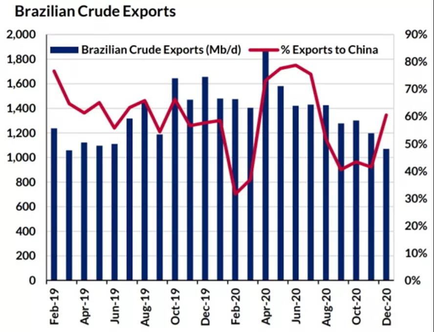 船舶經(jīng)紀(jì)公司Gibson在其最新周報(bào)中表示:“自2019年以來(lái),巴西已成為拉丁美洲最大的原油出口國(guó),2020年原油日裝船量達(dá)到創(chuàng)紀(jì)錄的140萬(wàn)桶。巴西石油公司宣布計(jì)劃在2021-2025年將該公司的原油出口量翻一番。”